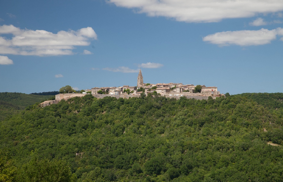 Emergeant de la forêt, le bourg est dressé en position de forteresse sur une roche plate, en dominant la vallée de la Vère. |
