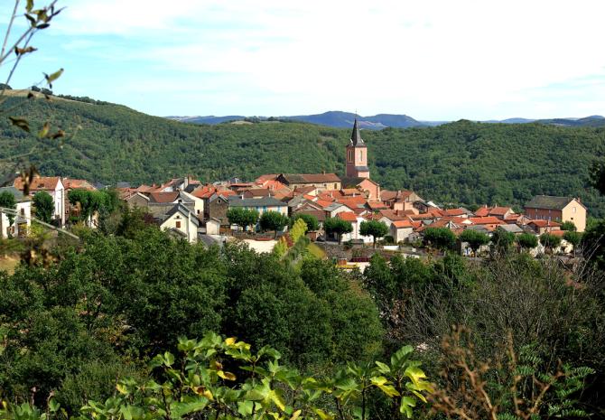 village est situé sur le rebord du plateau du Lévezou, face aux grands