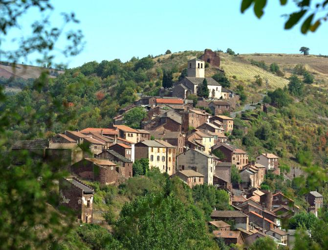 Montagne Noire. Le village de grès rose, bâti en forteresse autour de